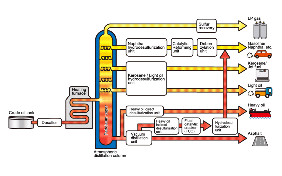 - Petroleum refining is the process of refining crude oil to produce a wide variety of products, such as fuel oil and petrochemical products. Differences in boiling points are used to separate the crude oil mixture into its constituent components, which are then separated on the shelf stages inside the atmospheric distillation column. Naphtha and benzene, which have low boiling points, are extracted at the top plate, and heavy oil, which has a high boiling point, is extracted at the bottom. Then, after undergoing sulfur removal and other treatments, they are shipped as high-quality products (gasoline, kerosene, jet fuel, etc.).