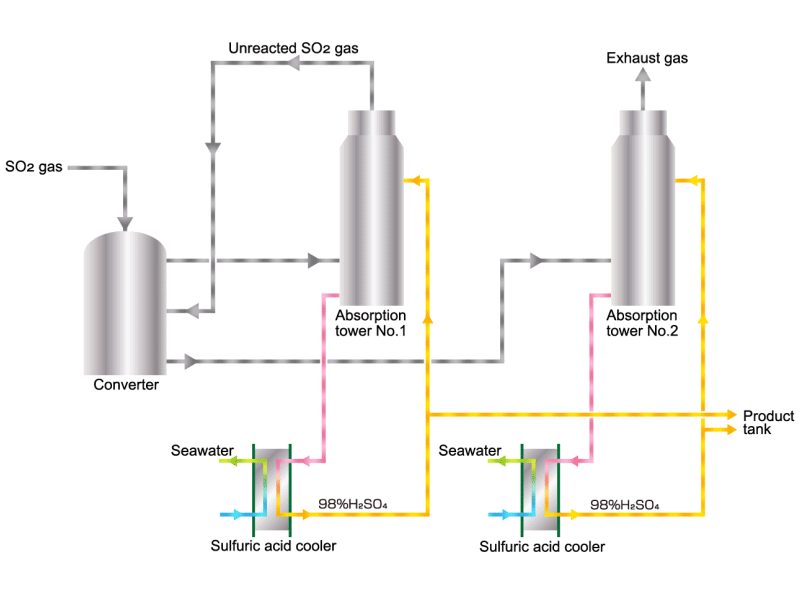 - Sulfuric acid is recovered by removing impurities from sulfur dioxide (sulfurous acid gas), which generated during the smelting process of non-ferrous metals, such as copper sulfide and zinc sulfide. HISAKA heat exchangers are often used as coolers for washing columns, drying columns, absorption columns, etc. during the sulfuric acid manufacturing process.