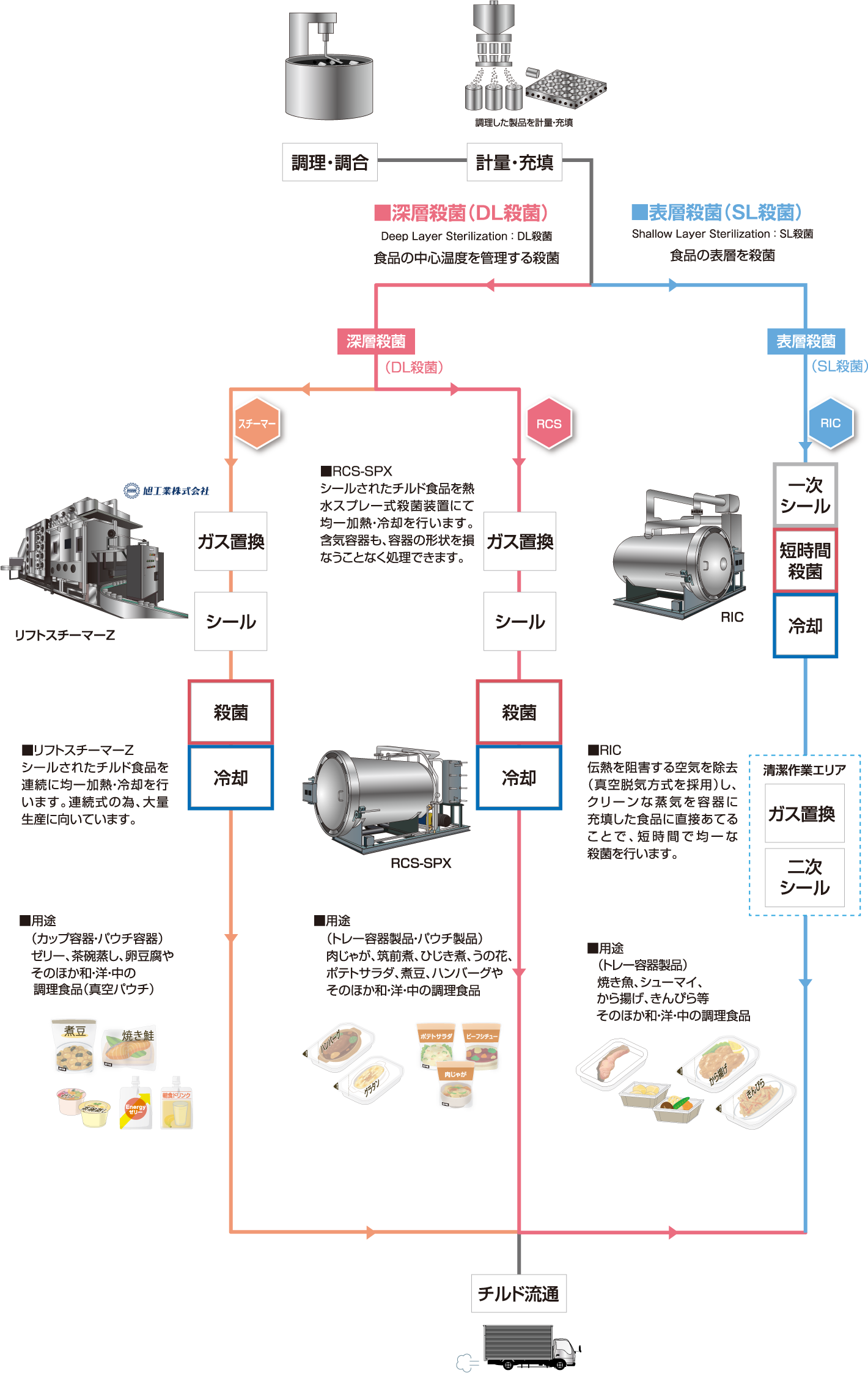 日持ちがしておいしい調理食品のためには、低温殺菌と最適な冷却が重要な役割を担います。低温殺菌とはおいしさを損なわない調理温度帯付で、低温発育性の菌を殺菌することです。最適な冷却とは菌の発育しやすい温度帯を可能なかぎり素早く冷却する事です。両方が揃って初めて日持ちがするおいしい調理食品ができます。