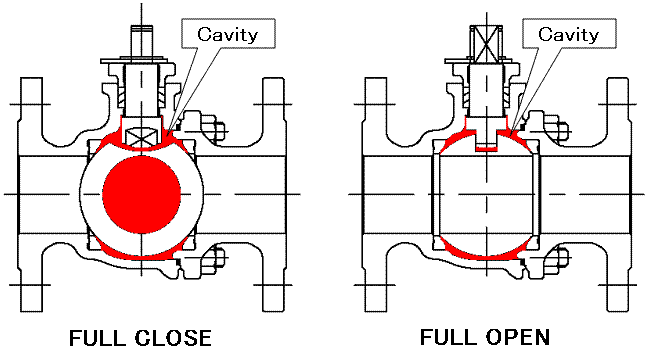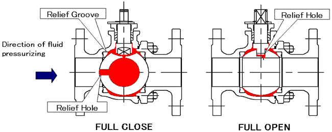 Simultaneous occurrence of conditions such as the followings in floating-type soft seat ball valves may cause the temperature of the fluid in body cavity (pocket) to increase, resulting in thermal expansion and an abnormal temperature increase in the airtight cavity isolated from the fluid passage:
