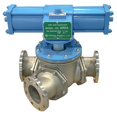 メタルシートのY型三方ボールバルブです。ソフトシートでは摩耗が激しいなど対応が困難であった粉体,スラリー、高粘度流体、開閉頻度が多い等過酷な条件でも使用可能です。