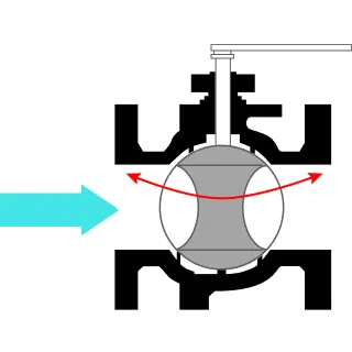 ボールバルブはその中の「回転」の概念により、流体を流す(ON)、及び止める(OFF)用途に使用されます。また、バルブの流路と配管径が同等の「フルボア構造」のため、流体抵抗が非常に小さく、圧力損失が少ない弁種です。弁体を90度回転させればON-OFFが可能となるため、操作性に優れ、操作時間が短いという長所があります。