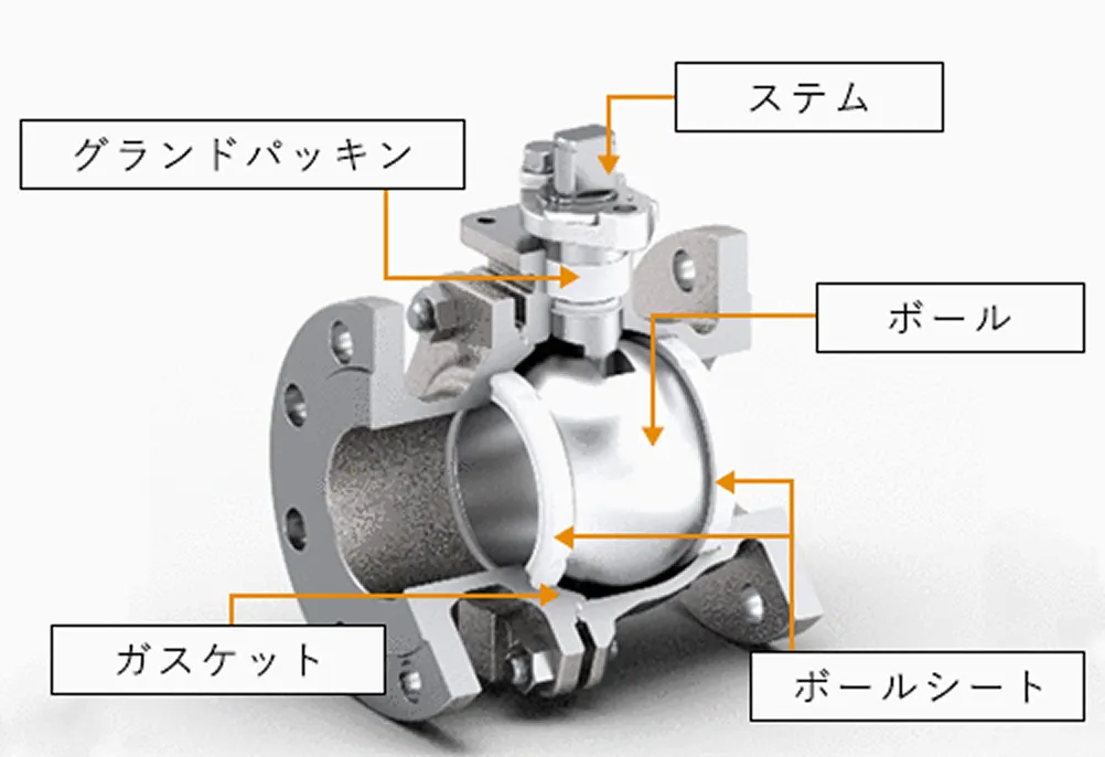 ボールバルブは一般的に弁体である「ボール」を「ボールシート」と呼ばれる2枚のシートリングで挟み込む構造をしており、ボールと連結した「ステム」を前述の通り、90度回転させればON-OFFが可能です。